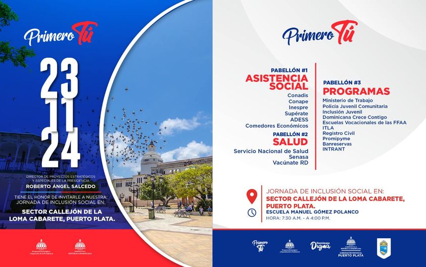 ATENCIÓN A TODOS LOS MORADORES DE CABARETE *LOS PROYECTOS ESTRATÉGICOS Y ESPECIALES DE LA PRESIDENCIA, LA GOBERNACIÓN PROVINCIAL Y LA ALCALDÍA LES INVITAN A LA GRAN JORNADA DE INCLUSIÓN SOCIAL, «PRIMERO TÚ » QUE SE LLEVARÁ A CABO ESTE SÁBADO 23 DE NOVIEMBRE DESDE LAS 7:00 AM HASTA LAS 3:00PM, EN LA ESCUELA PROF. MANUEL GOMEZ POLANCO DONDE ESTARAN LOS SIGUIENTES SERVICIOS: