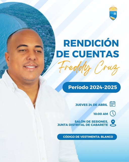 La Junta Distrital de Cabarete y su Director, Freddy Cruz, tienen el honor de invitarle al acto de Rendición de Cuentas correspondiente al período 2024-2025.